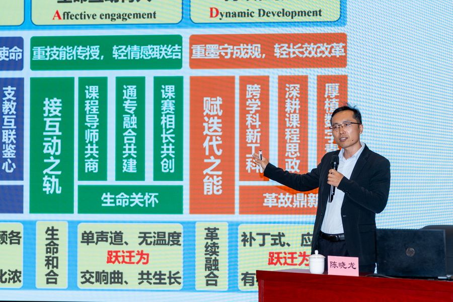 陈晓龙以“LEAD范式下新工科电类基础课育人体系”为题,首先从探究式教学的体系重塑、教材建设、课程建设、方法改革、竞赛成长等五个方面分享了经验。他以“青教赛”为核心,从参与青教赛的初衷、青教赛的具体要求,以及参与青教赛的收获等三个方面从宏观上介绍了参与青教赛的经历,分享了竞赛过程对其自身成长的影响,阐述了如何以竞赛促进教学及课程思政水平的提升,并从勤学、深思、细磨、苦练四个维度详细介绍了课程思政融入的方式方法以及备赛的实际操作经验。讲座的最后部分,陈晓龙详细介绍了他如何通过课前8分钟主题分享、课后互动答疑、课程群共建、学长学姐寄语等方式,构建了全方位、全过程、深情感的师生互动机制,实现“教书”与“育人”的有机统一,把课程思政贯穿于课堂内外的宝贵教学改革经验。