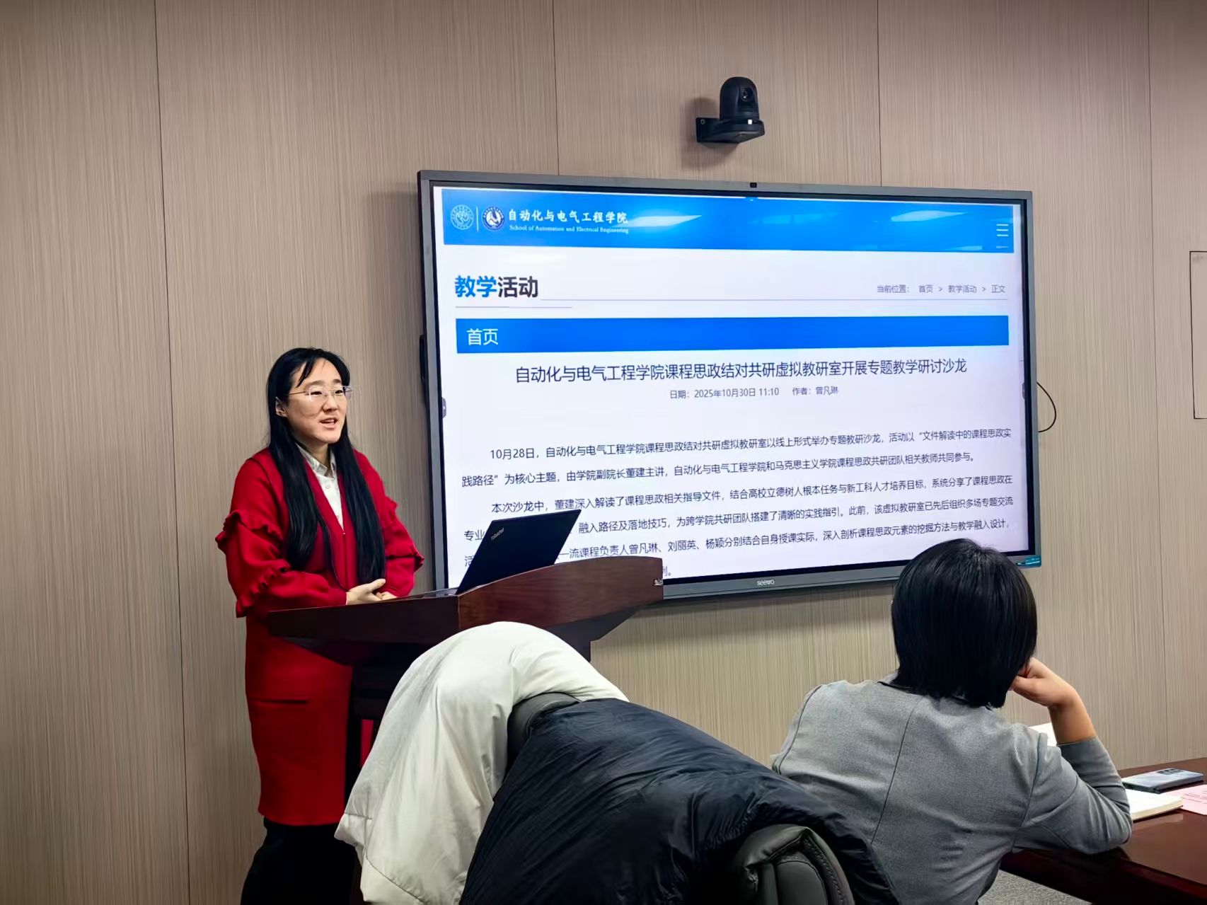 随后来自4个不同学院的课程思政共研团队代表依次作交流发言,分享各团队在课程思政建设中的创新实践与特色经验。机械学院共研团队段磊老师回顾了本学院研讨沙龙开展情况,介绍了学院的“133N”思政育人模式,围绕《工程材料及热处理》、《机械制图》、《人机工程学》等课程阐释了如何将家国情怀、工匠精神与专业课程内容相融合,通过案例教学、项目实践等方式,引导学生树立科技报国志向;自动化与电气工程学院共研团队成员曾凡琳老师分享了本学院教研沙龙开展情况,以《电力电子技术》、《测控电路》等课程为例阐述了聚焦面向新时代工匠之师培养的新工科专业课课程思政建设思路与教学成果;理学院副院长、共研团队成员盛朝霞老师介绍了理学院通过“五大学科课程组矩阵式组队” “联合备课与示范课闭环机制构建”等方式开展课程思政的举措与经验,以《大学物理》《工程光学》等课程为例,阐述了如何挖掘课程中的科学精神与理性思维元素,将思政教育润物无声地融入逻辑推导与理论教学中;工程实训中心课程思政共研团队田永军老师分享了本团队通过“典型案例库建设”“微研讨”等方式”开展教研沙龙的举措与成效,介绍了中心在《职业技能训练 3-2》、《金工实习》等实习实训课程中建设中强化职业素养、劳动观念与安全责任意识的具体做法,凸显了“做中学、学中悟”的思政育人模式。各共研团队教师代表的发言紧扣专业特色,既有理论思考又有实践案例,充分展现了我校课程思政建设的多元探索与阶段性成效。