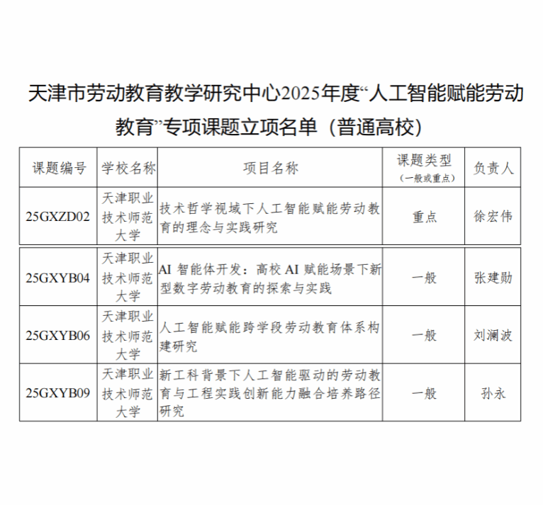近日,天津市劳动教育教学研究中心正式公布2025年度“人工智能赋能劳动教育”专项课题立项结果,我校课题申报喜获佳绩,共获批立项4项,其中重点项目1项、一般项目3项,立项数量与层次位居全市高校前列,充分展现了我校在人工智能赋能劳动教育研究领域的坚实基础与创新实力。