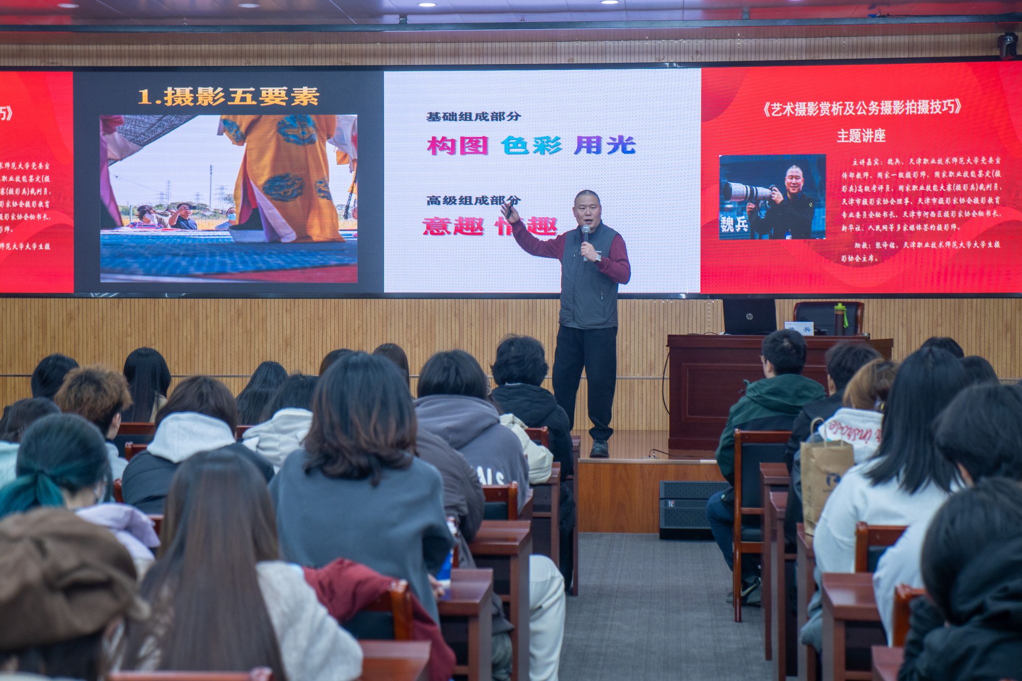 为深化落实学校美育浸润行动,全面推进健康学校建设,提升学生摄影技能与审美素养,3月17日下午,由体美劳教育中心牵头,党委宣传部指导,联合党委学工部、团委共同举办的《艺术摄影赏析及公务摄影拍摄技巧》主题讲座在师资培训楼一楼报告厅顺利举办。讲座特邀我校党委宣传部教师、国家一级摄影师魏兵主讲,大学生摄影协会主席张译铭同学担任助教,全校近二百名师生参与讲座。体美劳教育中心副主任刘鑫琼主持活动。